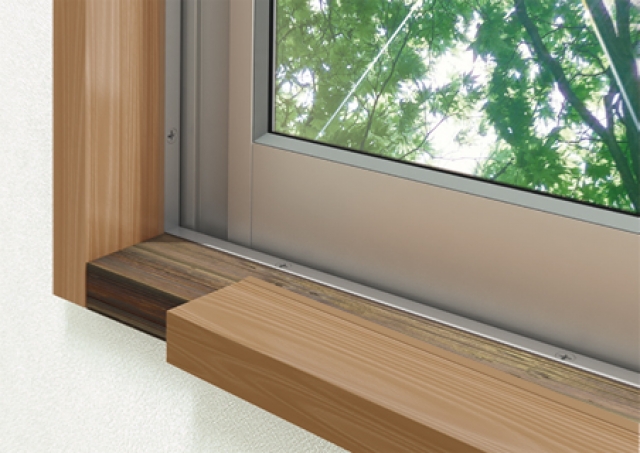 また、表面はキレイな木目のデザインになっているため、一目見ただけでは樹脂製だとは分かりません。そのまま上からかぶせただけだと、窓に付着した水滴が流れ落ちて、既存の窓枠を腐らせてしまう可能性がありますが、この商品には水の浸透を防ぐための見切り材が付属しているので安心です。さらに、さまざまなサイズの窓枠に対応できるよう、厚みを調整するためのスペーサーまで付いています。